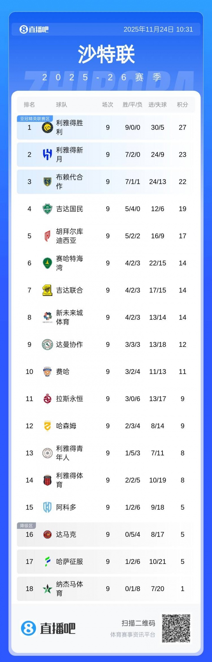 你的位置:意甲直播 > 德甲球队 > 沙特联积分榜:奏效全胜4分领跑,月牙不败居第2,卫冕冠军仅第7