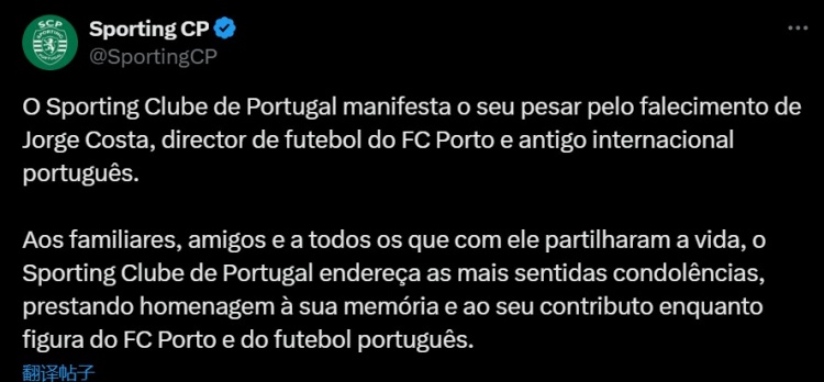 葡萄牙体育官方写谈:“俱乐部对葡萄牙前国脚、波尔图俱乐部现任足球高管若热-科斯塔的死灭暗意追悼。”