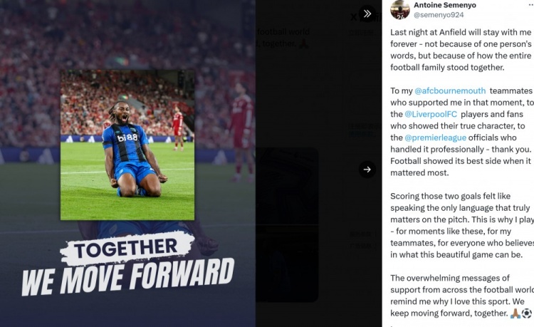 塞梅尼奥写说念:昨晚在安菲尔德的资格将永远谨记我心,不是因为某个东说念主的言语,而是因为扫数足球大家庭的相助。