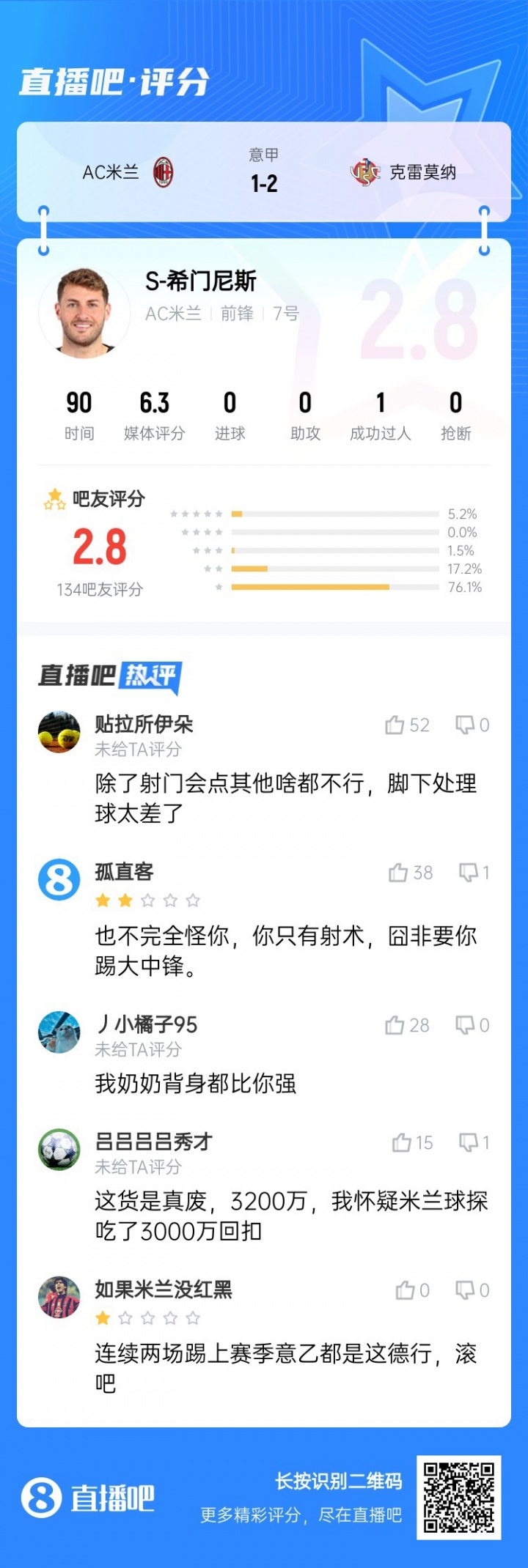你的位置:意甲直播 > 德甲球队 > 3200万引进!希门尼斯回身送球权&致米兰失球,意甲首轮仅2.8分