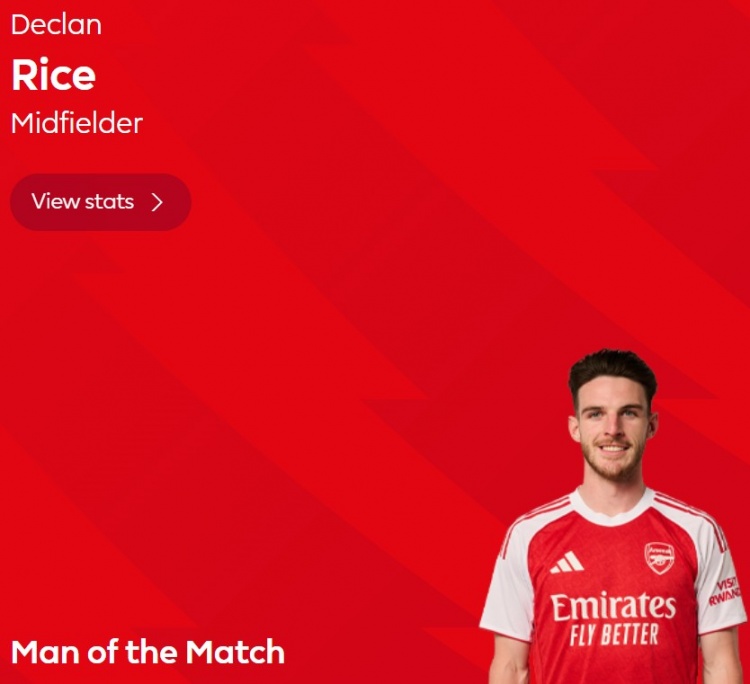 本场比赛赖斯面临旧主发扬出色,打进一球,赛后他也当选英超官方球迷票选全场最好球员。