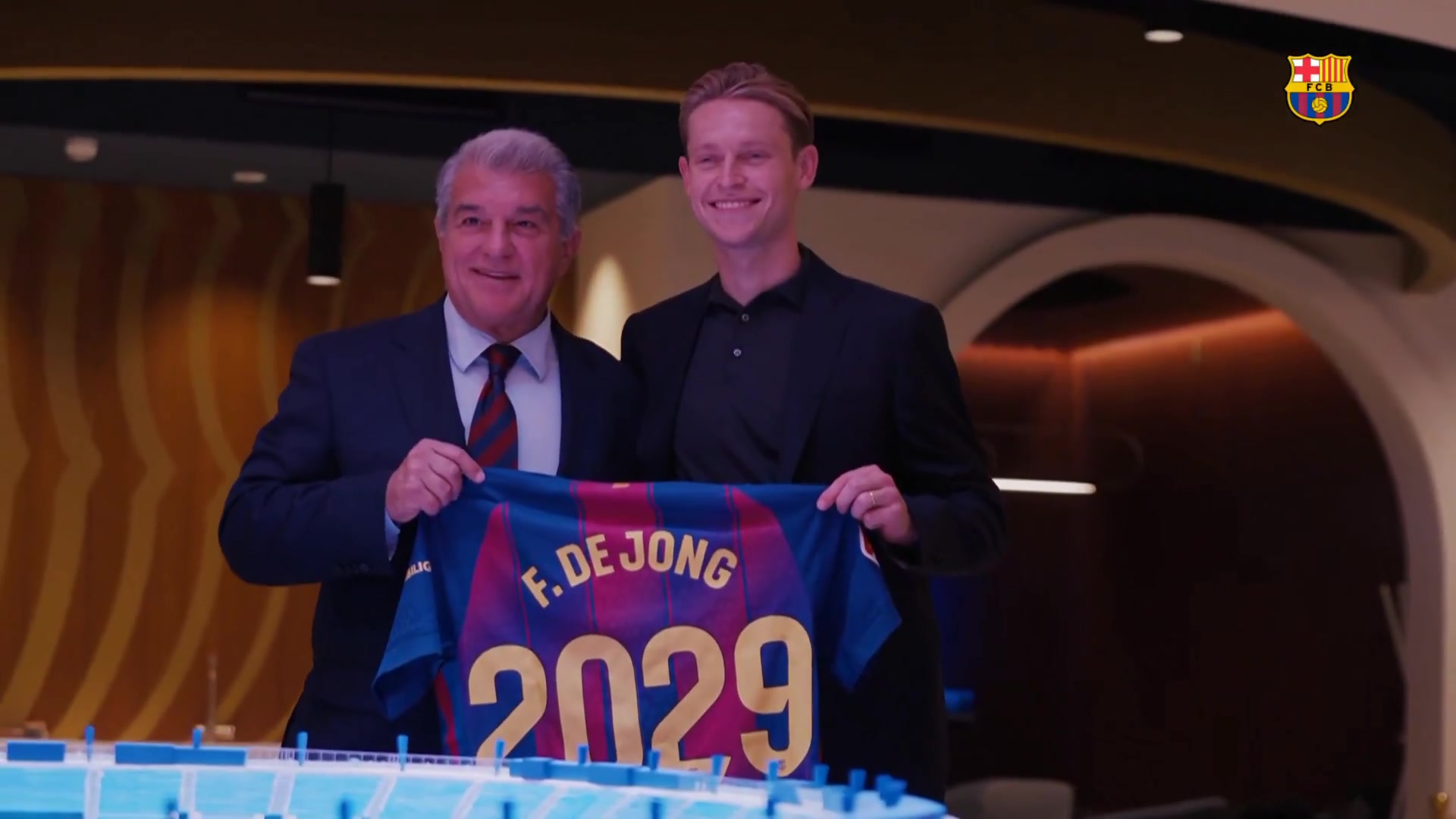 在续约完成后,巴萨在官方叮嘱媒体上晒出拉波尔塔与德容展示球衣的视频,牵挂德容续约顺利,球衣上有2029字样。