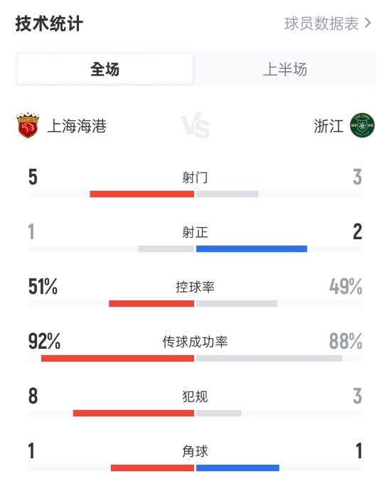 你的位置:意甲直播 > 德甲球队 > 海港半场1-0浙江数据:射门5-3,射正1-2,控球率51%-49%