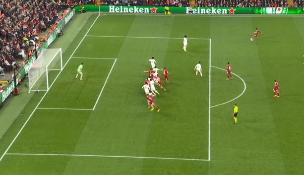 11月5日讯 欧冠第4轮利物浦vs皇马,索博落拓球开入禁区,麦卡利斯特头球破门!