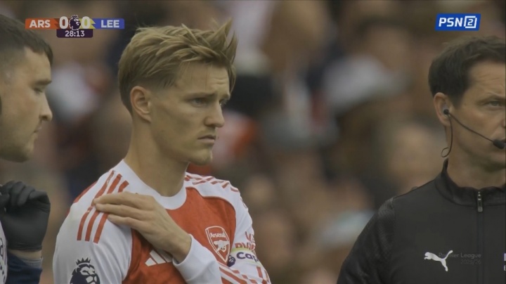 08月24日讯 英超第2轮阿森纳vs利兹联第26分钟,厄德高被利兹联球员放倒后肩膀疑似受伤,经队医查验后暗意仍能连续比赛。