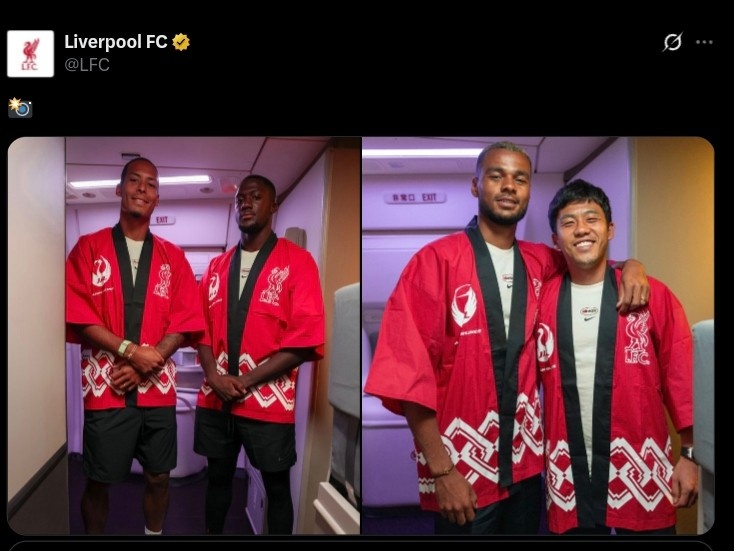 在飞往东京的航班上,日本航空向利物浦全员转圜了日本传统衣饰,利物浦官推也晒出范迪克、科纳特、加克波以及远藤航的相片。