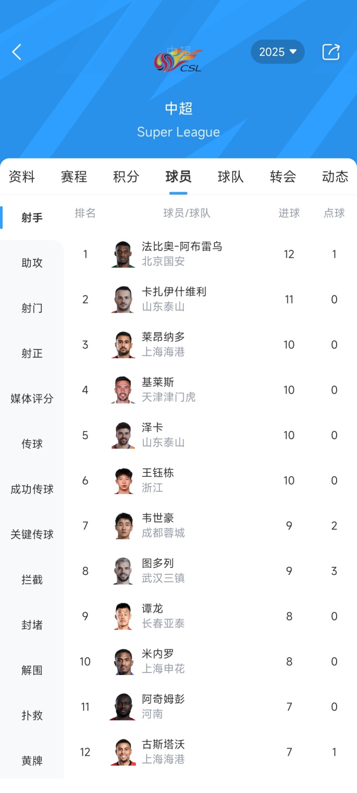 中超弓手榜上,国安先锋法比奥不绝以12粒进球独占鳌头,泰山外助卡扎伊什维利凭借本轮的帽子戏法,11球跃升至弓手榜第2;莱昂纳多、基莱斯、泽卡、王钰栋4东说念主10球并排第3名。