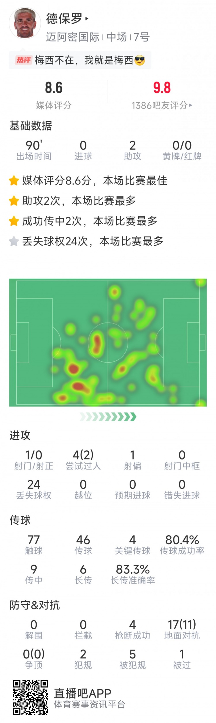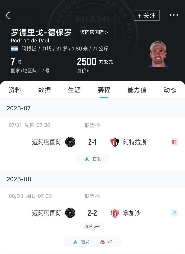 31岁的德保罗7月底加盟迈阿密海外,加盟后出战2场比赛一起打满。本场比赛,德保罗两次送出助攻,赛后当选全场最好球员。