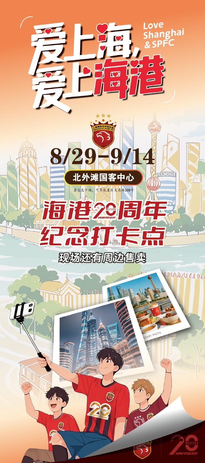风雨二十载,上海海港与您联袂渡过。在俱乐部将迎来20岁诞辰之际,咱们于8月29日——9月14日在北外滩国客中心船埠特设上海海港20周年讲求打卡点与特质相近展位,诚邀每一个深爱足球、钟意海港的你,共享互相点滴并预测翌日渴望。