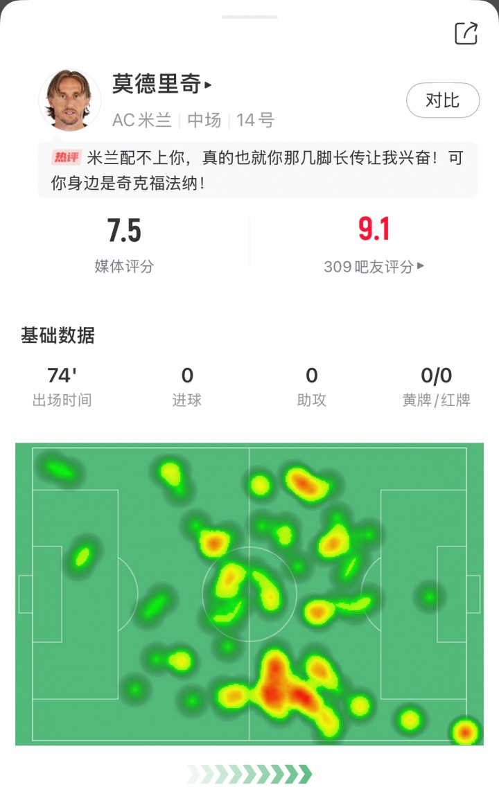莫德里奇9月9日就将满40岁,本场比赛他首发出战74分钟,热区图隐秘全场。2射门1射正,送出3次要道传球,传球告捷率90.8%,还有2突围1阻难,媒体评分7.5。
