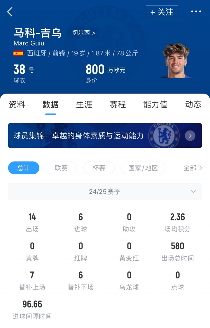 吉乌时年19岁,上赛季为切尔西出场14场,赢得了4粒进球,现在其德回身价为800万欧。