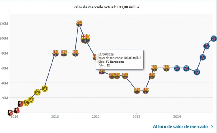 登贝莱身价最低时只好3000万欧,前次身价达到1亿欧元,还要追想到2019年服从于巴萨时分。