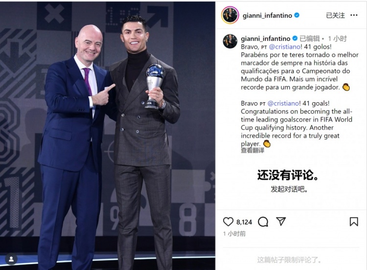 因凡蒂诺写谈:“太棒了,C罗!41粒进球!祝愿你成为世初赛历史最好弓手,这位着实伟大的球员再次斩获不凡记录。”