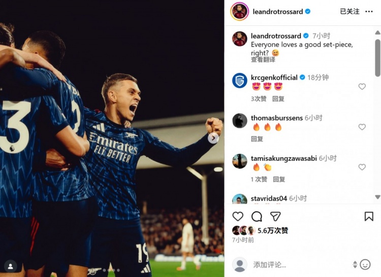 赛后特罗萨德也在个东说念主社媒晒出庆祝进球相片,配文写说念:“东说念主东说念主齐爱高质地的定位球,难说念不是吗😉”