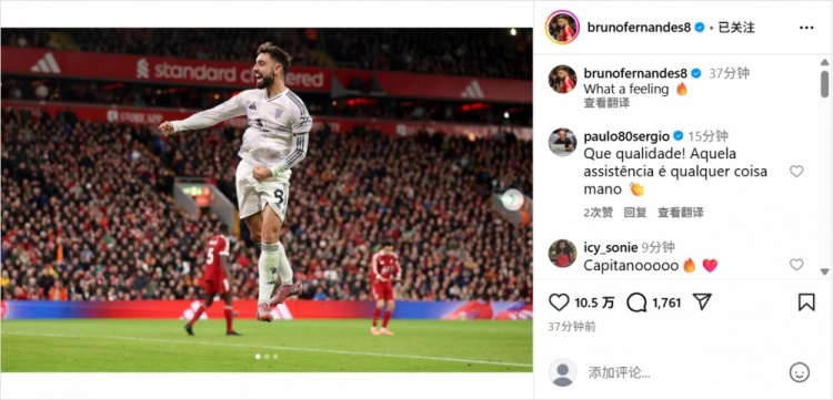 10月20日讯 本轮英超焦点战,曼联2-1客得手物浦。赛后,曼联队长B费更新社媒庆祝得手。