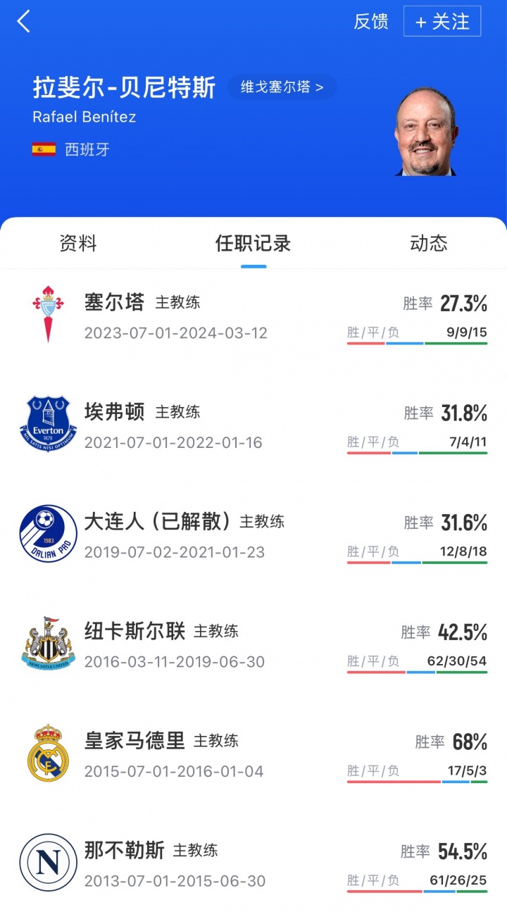 贝尼特斯现年65岁,在前年3月份离开塞尔塔帅位后失业于今。贝尼特斯此前曾握教过利物浦、国米、切尔西、那不勒斯和皇马等权门,荣誉等身,包括2次西甲冠军、1次欧冠冠军、2次欧联杯冠军和1次世俱杯冠军等。此外贝尼特斯还曾在2019年至2021年担任大连东谈主造就。