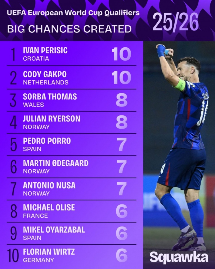 11月20日讯 本届世欧预小组赛仍是告一段落,squakwa也统计了本届赛事创造首要契机情况,佩里西奇和加克波并排居首。