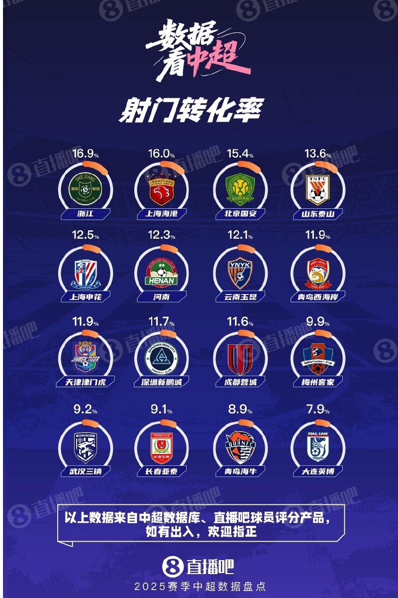 你的位置:意甲直播 > 中超直播 > 数据看中超|浙江领跑射门变嫌率 海港国本分列二三 大连英博垫底