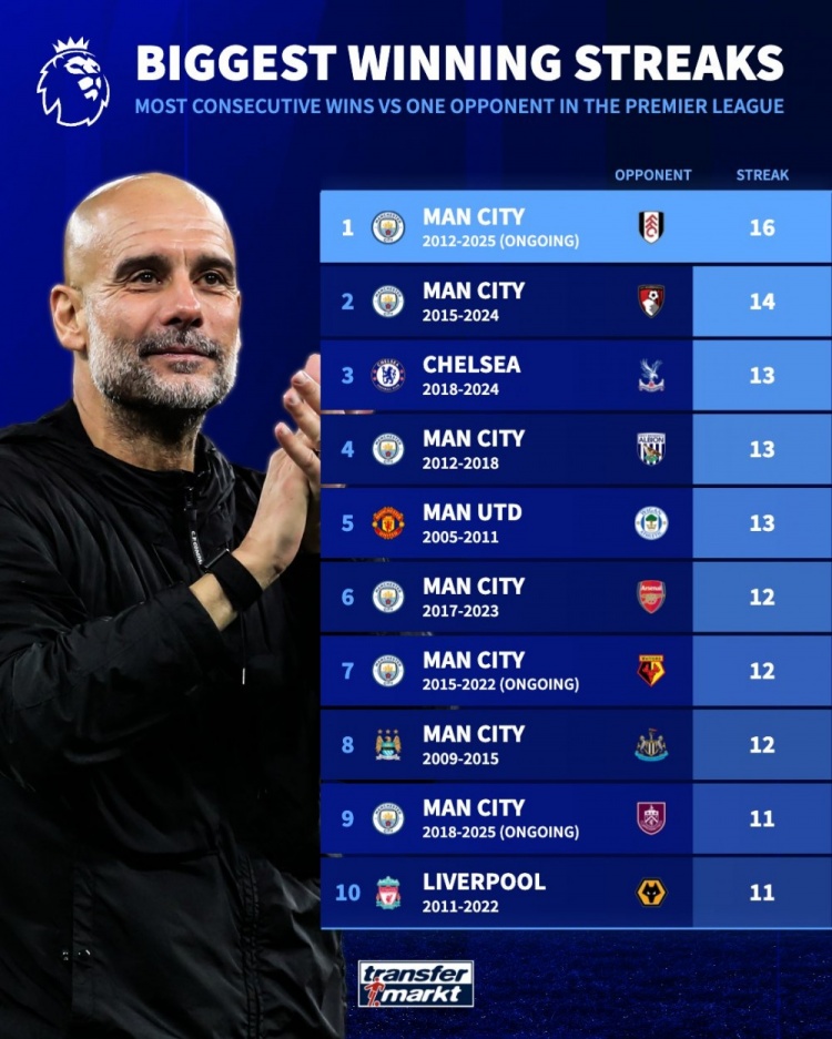 1.曼城 (对富勒姆),2012-2025年 (未破除),16连胜