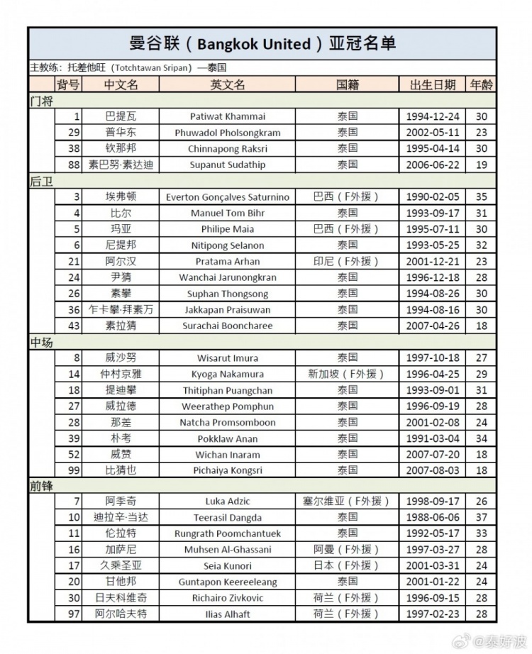 8月5日讯 据博主“泰好波”音问,曼谷联公布作客成齐蓉城的亚冠精英联赛履历赛名单,球队9外助出征。字据赛程,曼谷联vs蓉城的比赛8月12日19:35进行。