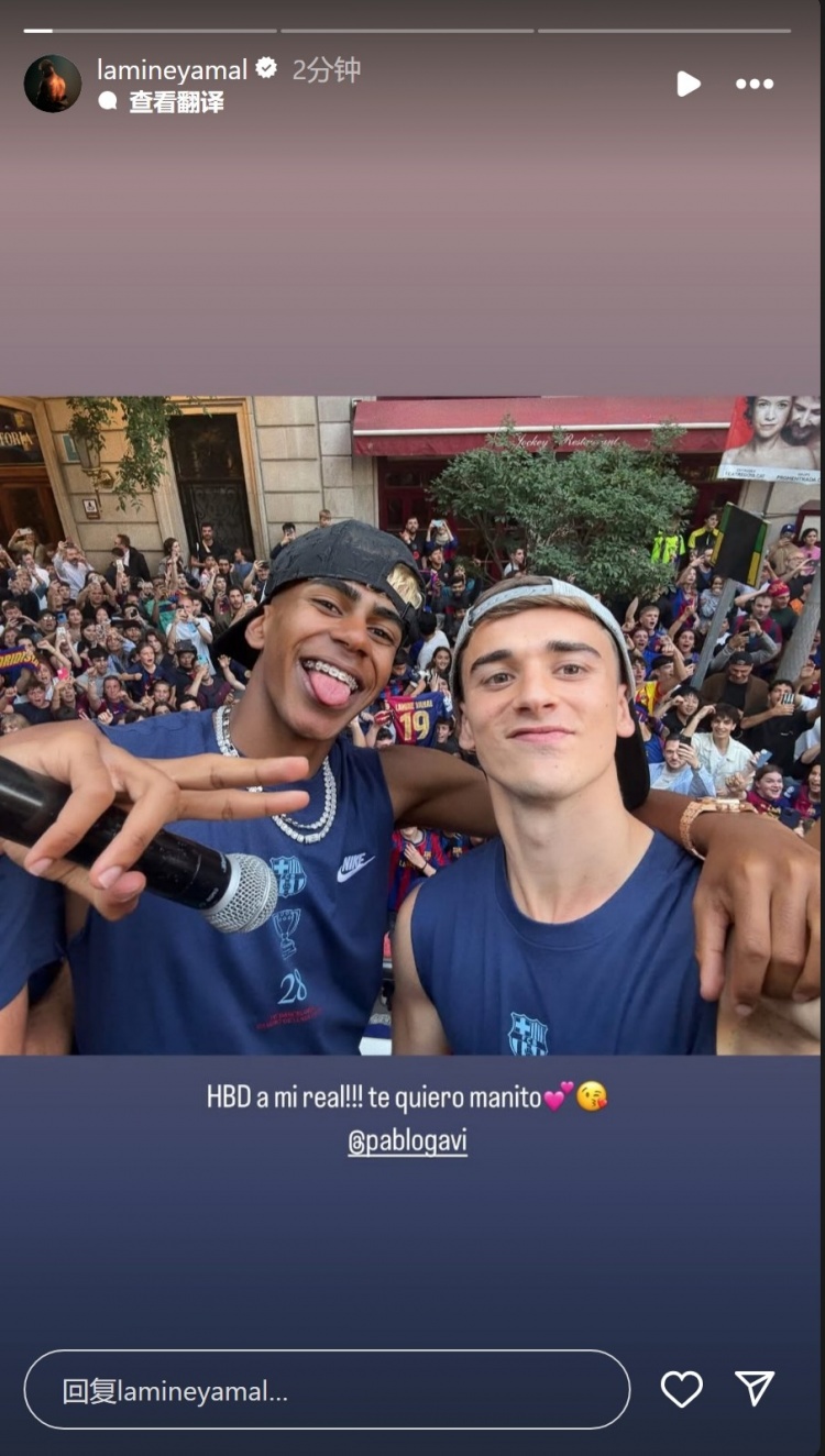 巴萨中场加维迎来21岁寿辰,亚马尔社媒晒出与加维在冠军游行中的合照,配文:“寿辰任性,我的石友!我爱你,昆玉!”