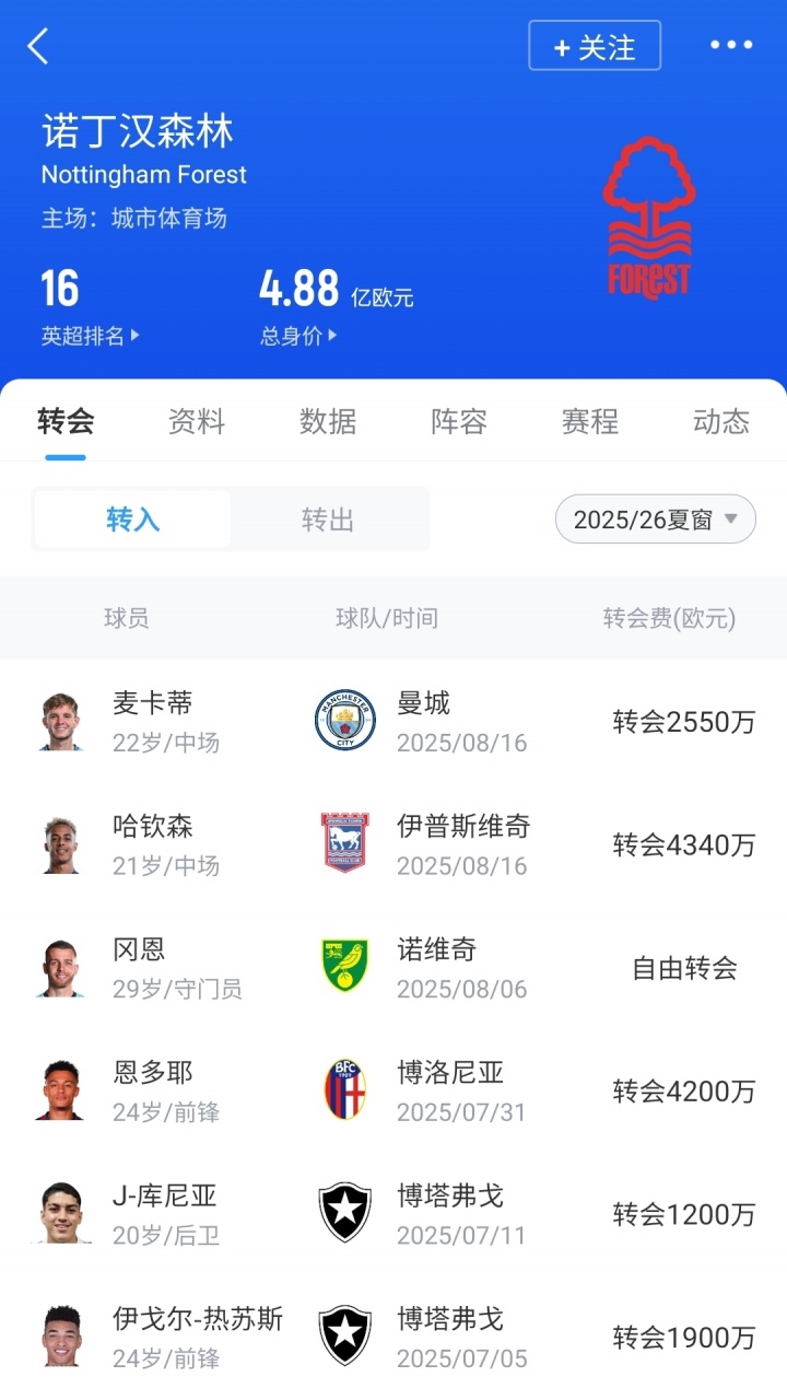 诺丁汉丛林今夏引援(认为1.734亿欧)↓