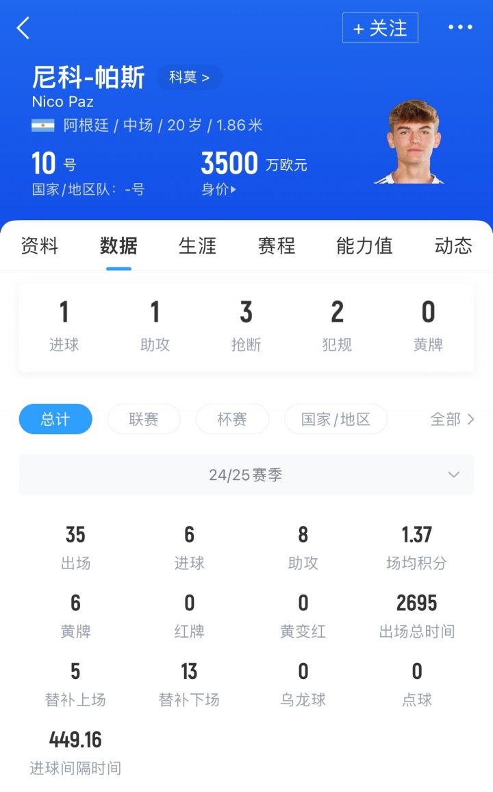 尼科-帕斯时年20岁,阿根廷籍中场,2024年8月从皇马卡斯蒂利亚600万转会至科莫。上赛季,他为科莫出场35场,获6球8助,当今其德回身价为3500万欧。