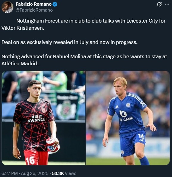 罗马诺默示:“诺丁汉丛林正在与莱斯特城谈后卫维克托-克里斯蒂安森的转会。”
