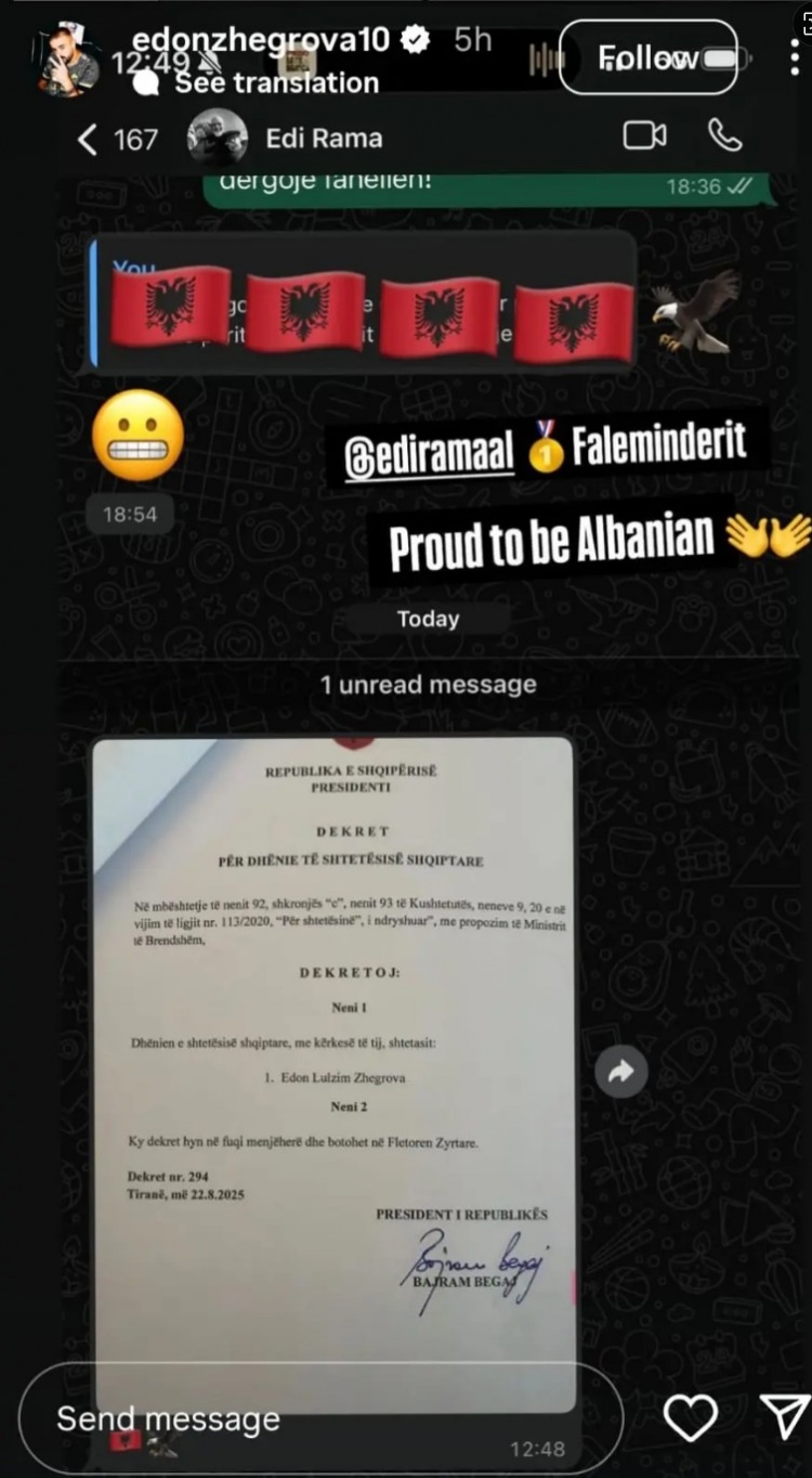 “为成为阿尔巴尼亚东谈主感到自爱,”哲格罗瓦在他的最新Instagram故事中写谈。这位26岁的球员通过父母领有科索沃-阿尔巴尼亚血缘。