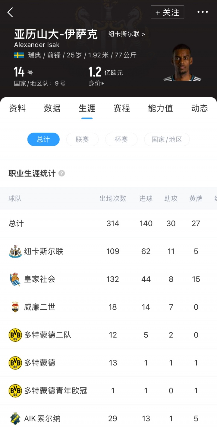 伊萨克现年25岁,瑞图书时尚。上赛季他为纽卡出场42场,打进27粒进球并收货6次助攻。现在其德回身价为1.2亿欧。