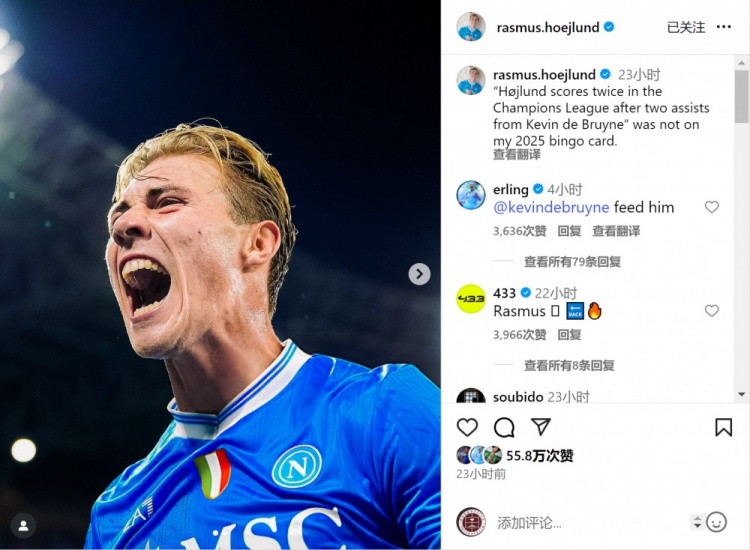 哈兰德留言@德布劳内,配文:“喂他吃饼(feed him)。”