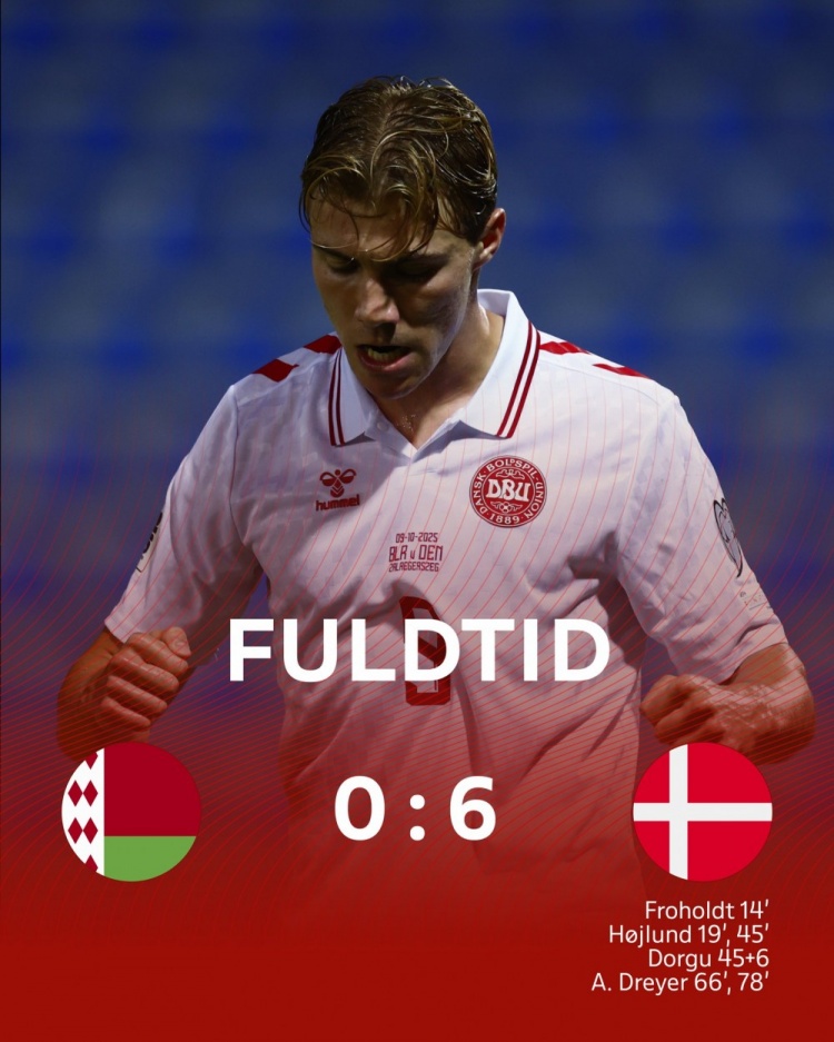 此役上半场弗罗霍尔特为丹麦首开纪录,霍伊伦梅开二度,多古赢得进球,丹麦4-0跳跃,下半场德雷尔双响,最终丹麦6-0大捷白俄罗斯。
