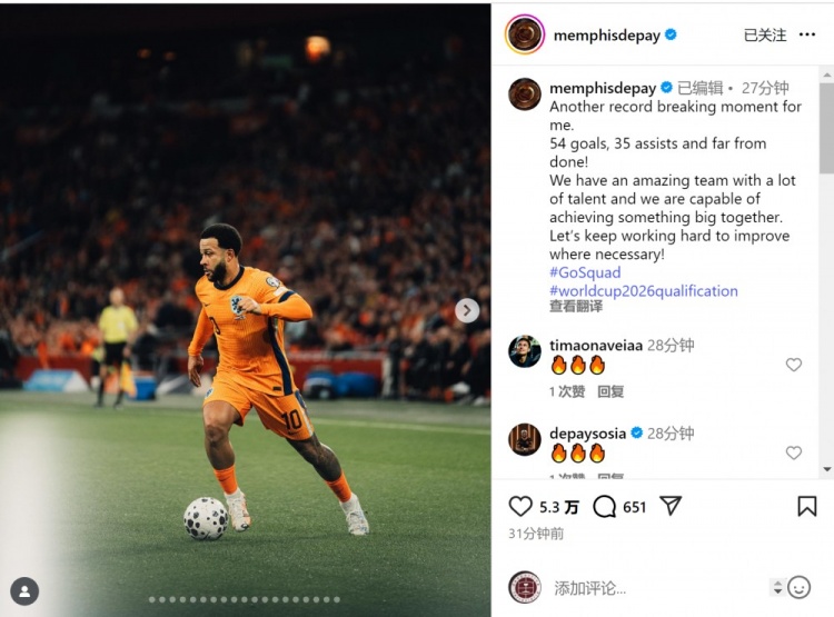 德佩社媒晒出比赛像片,并写谈:“对我来说又是一个突破记载的时分。 54个进球,35次助攻,何况远未适度!”