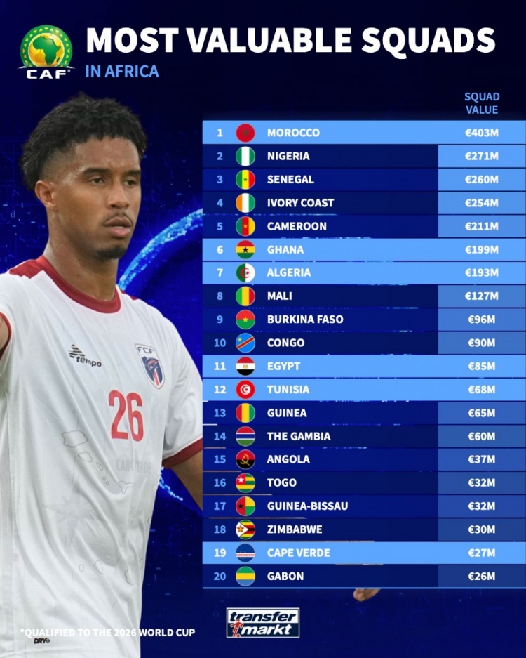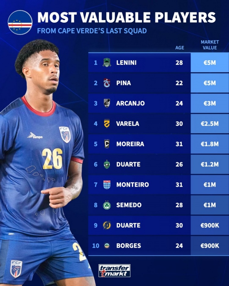佛得角全队身价2720万欧,比国足(1263万欧)的两倍还多,但在非洲仅排在第19位。佛得角阵中身价最高的球员为效用俄超克拉斯诺达尔的凯文-皮纳和效用土超特拉布宗体育的瓦格纳-皮纳,两东谈主身价均为500万欧元,全队8名球员身价逾越100万欧。