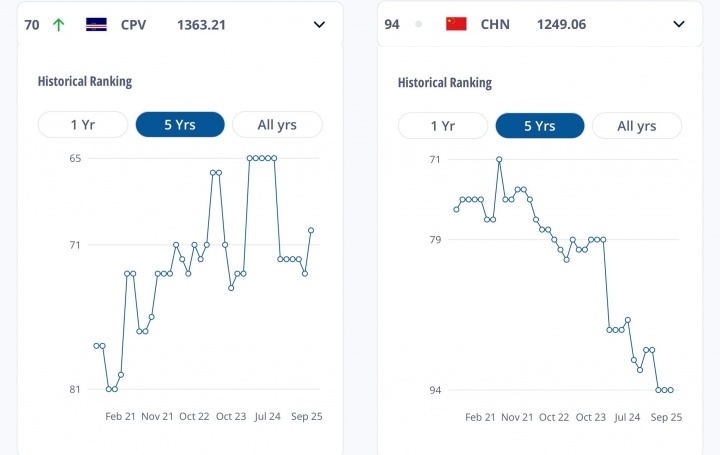 佛得角寰宇排行第70位,比国足(94位)高24位,在非洲排行第13位。