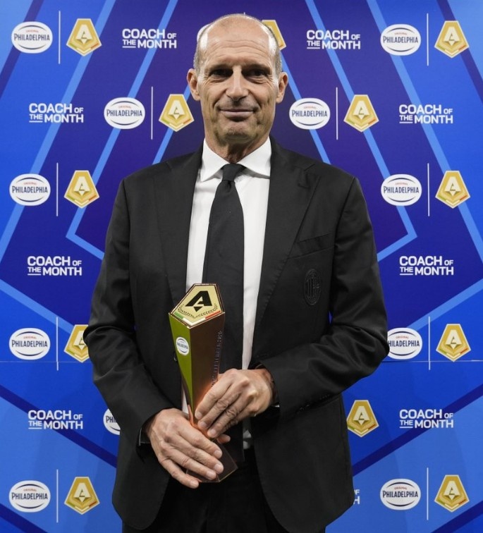10月25日讯 意甲官方晒照,米兰主帅阿莱格里在米兰对阵比萨赛前领取了九月最好西宾奖杯。