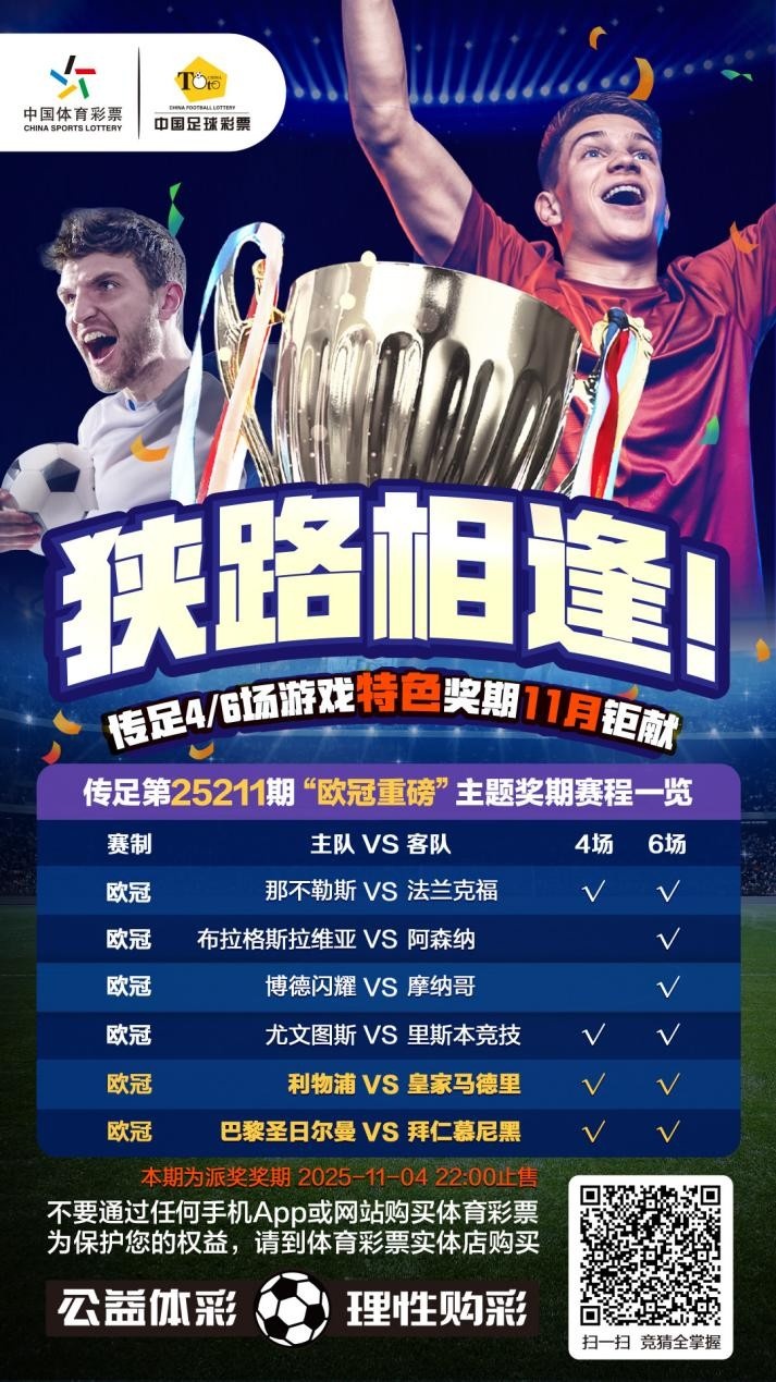 传足4/6场游戏性格奖期第25211期依然于2025年11月2日20:00开售,将于2025年11月4日22:00停售,并于11月5日开奖,其中那不勒斯VS法兰克福、尤文图斯VS里斯本竞技、利物浦VS皇家马德里和巴黎圣日尔曼VS拜仁慕尼黑为4场进球游戏竞猜赛事。
