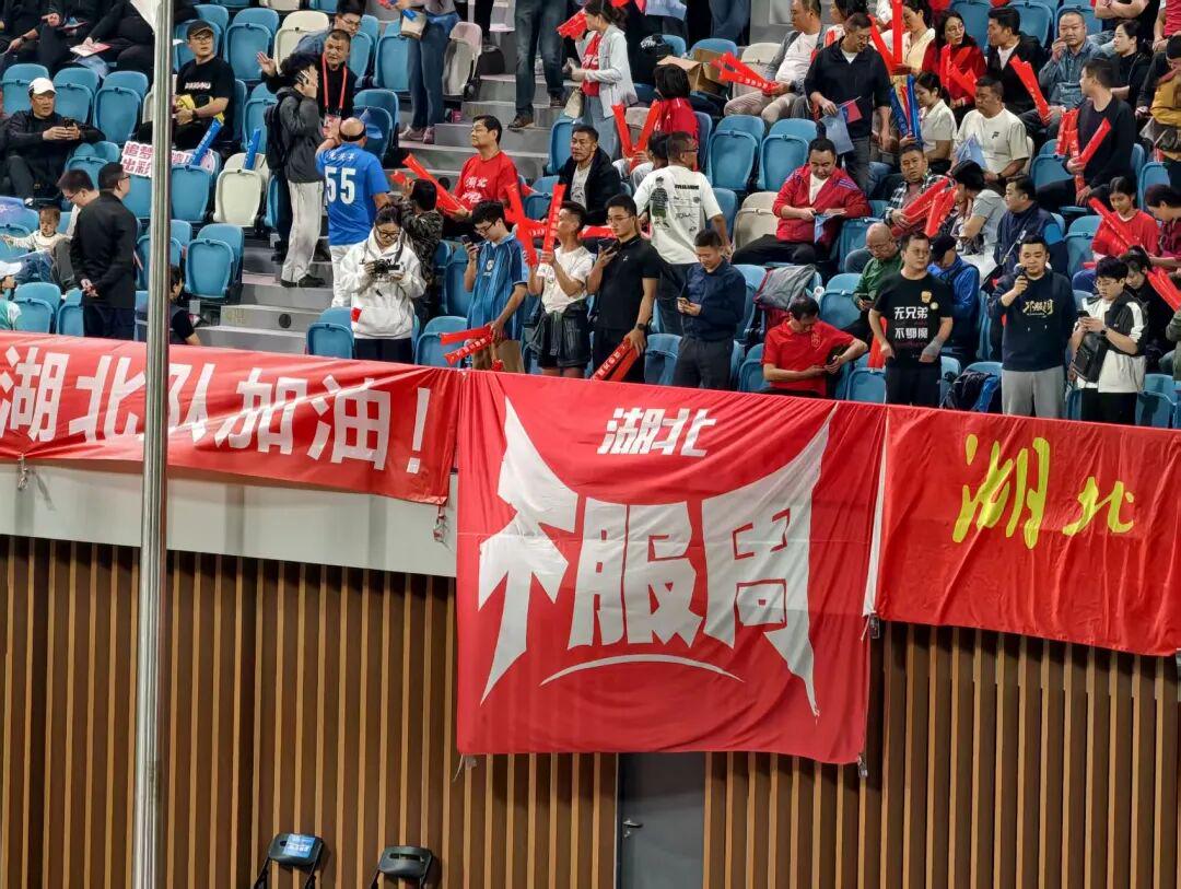 看台上,湖北球迷打出“湖北加油”,将“湖北造反周”的横幅挂在最显眼的所在,为球队呐喊恭维。别小看这数百名的恭维团,硬是力压主场作战的广东球迷团。