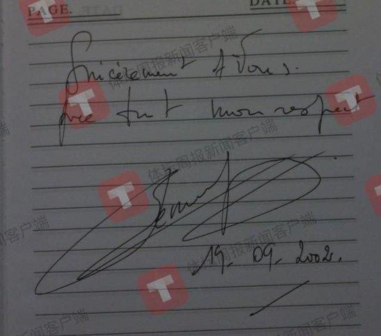 勒梅尔给记者的留言和签名。图/马德兴