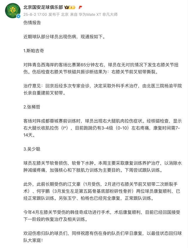 北京期间8月2日,北京国安官方文告:斯帕伊奇右膝流毒前叉韧带扯破,将选拔外科手术诊疗。除此以外还有张稀哲、吴少聪二东说念主的伤情信息公开。